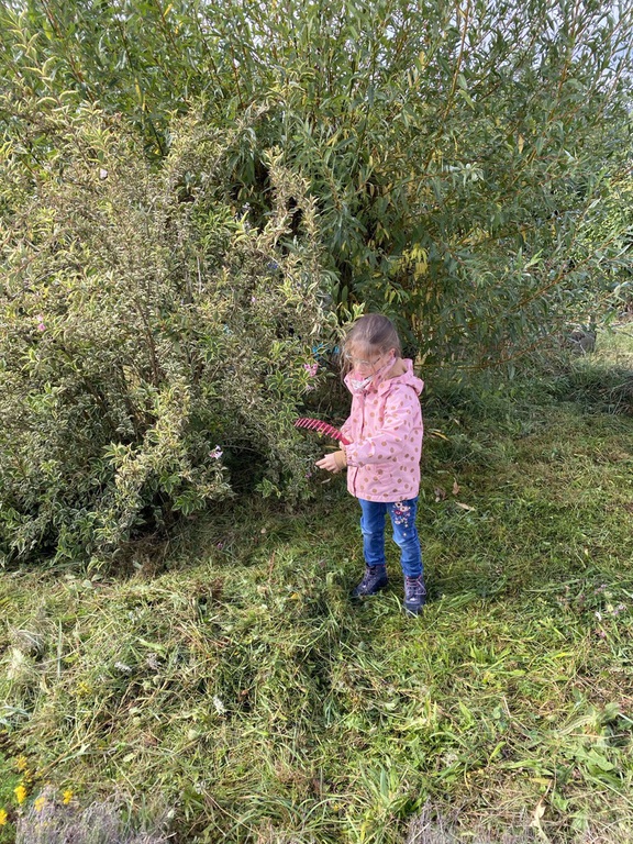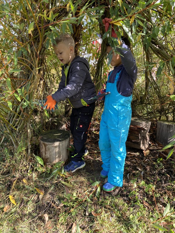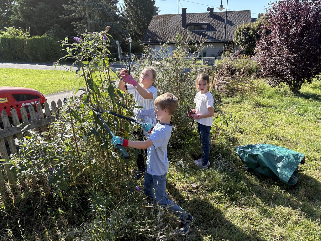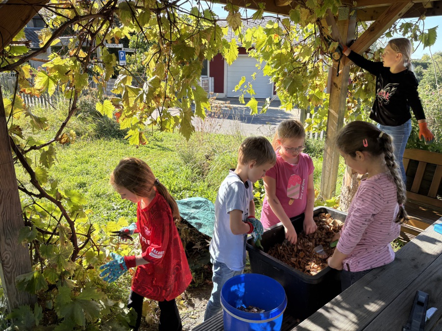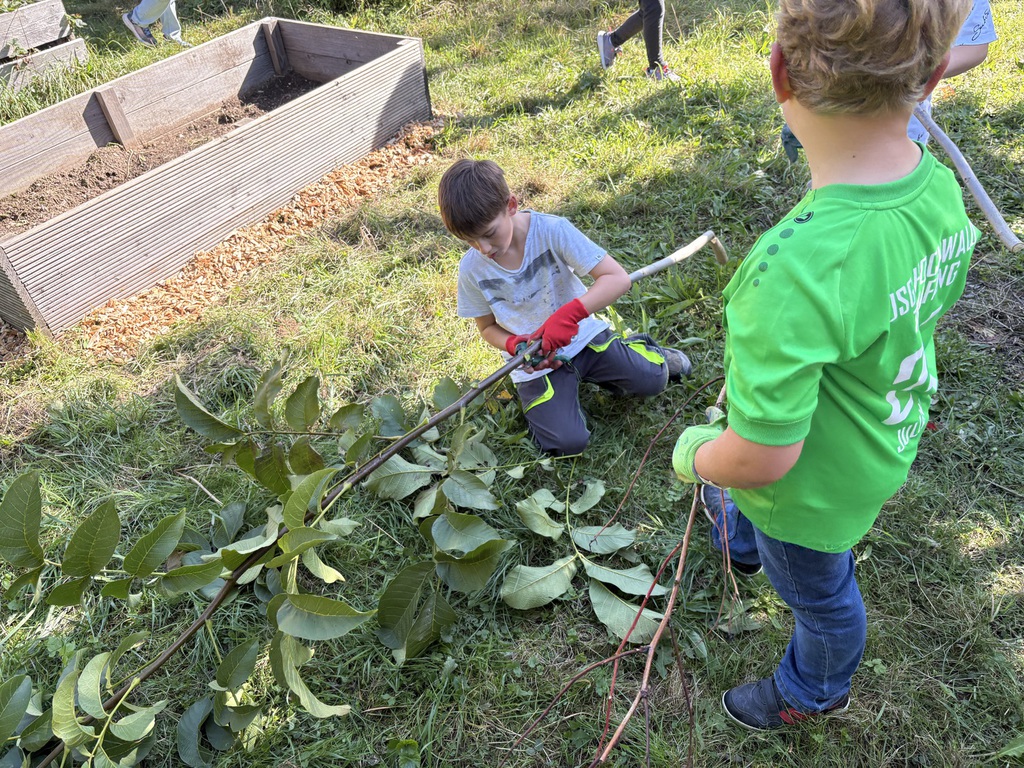 Heute sind wir, die Klasse 1, mit Maria, Mandy und Frau Imiolczyk im Schulgarten gewesen. Wir haben gemeinsam vertrocknete Blumen und Sträucher zurückgeschnitten. Andere Kinder haben das gemähte Gras zusammengerecht und danach alles in Säcke gepackt. Jetzt sieht der Schulgarten wieder ordentlich aus. Maria hat uns ganz viel beigebracht über das Insektenhotel, die Hagebutten und den Lavendel. Das hat Spaß gemacht!
